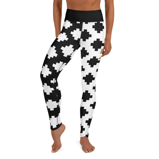 Black & White Mexica Pattern (with Gold Chimalli) - All-Over Print Leggings