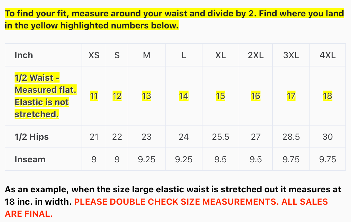 | 1/2 Waist - Measured flat. Elastic is not stretched. | 11 | 12 | 13 | 14 | 15 | 16 | 17 | 18 |