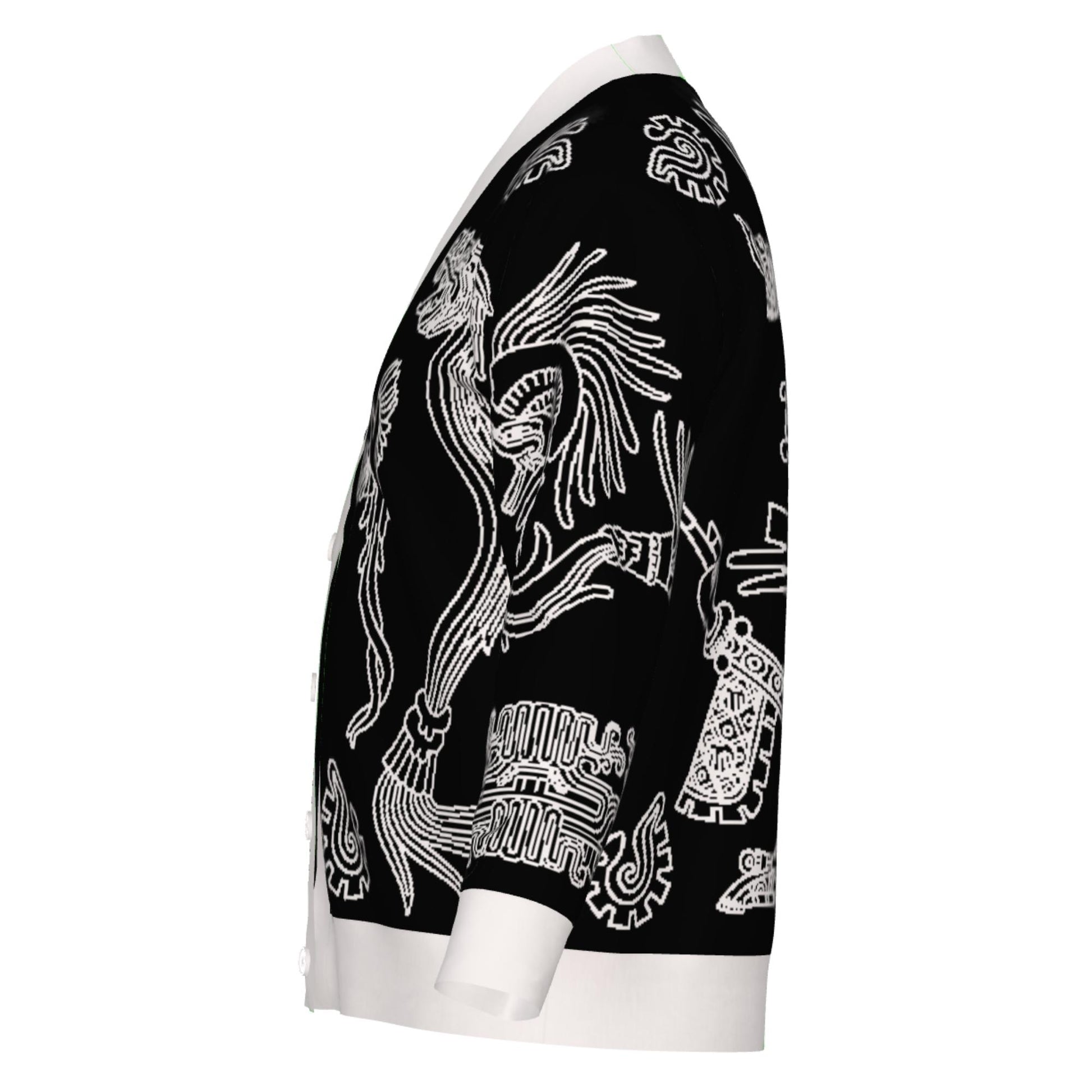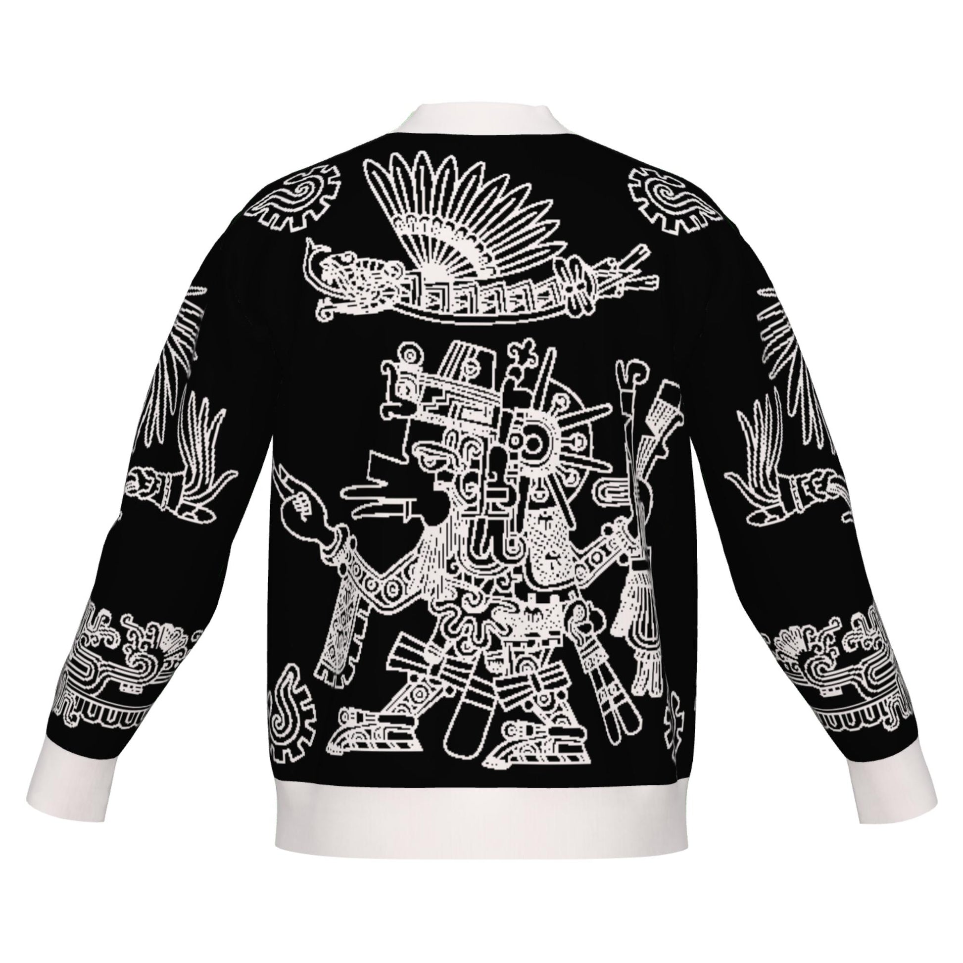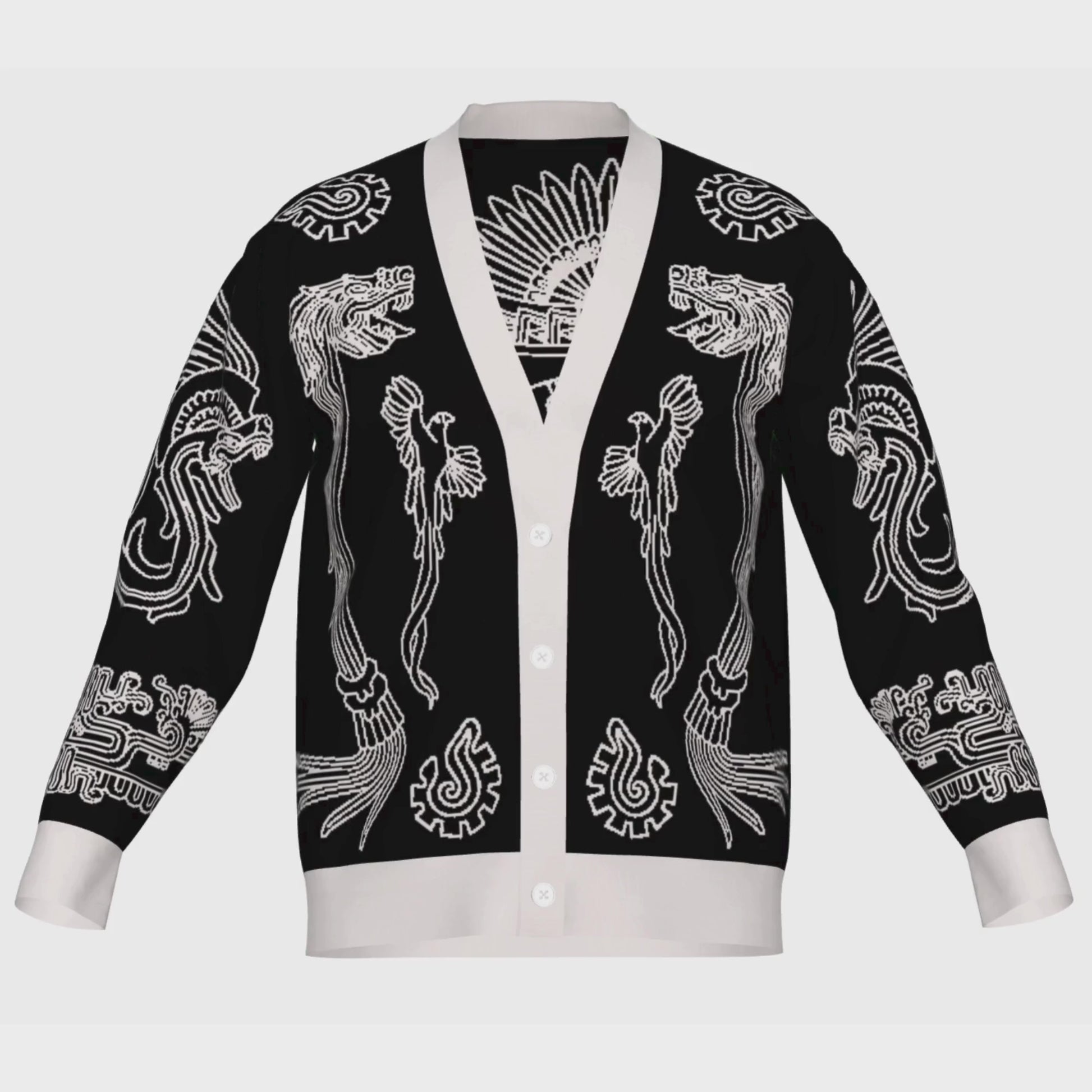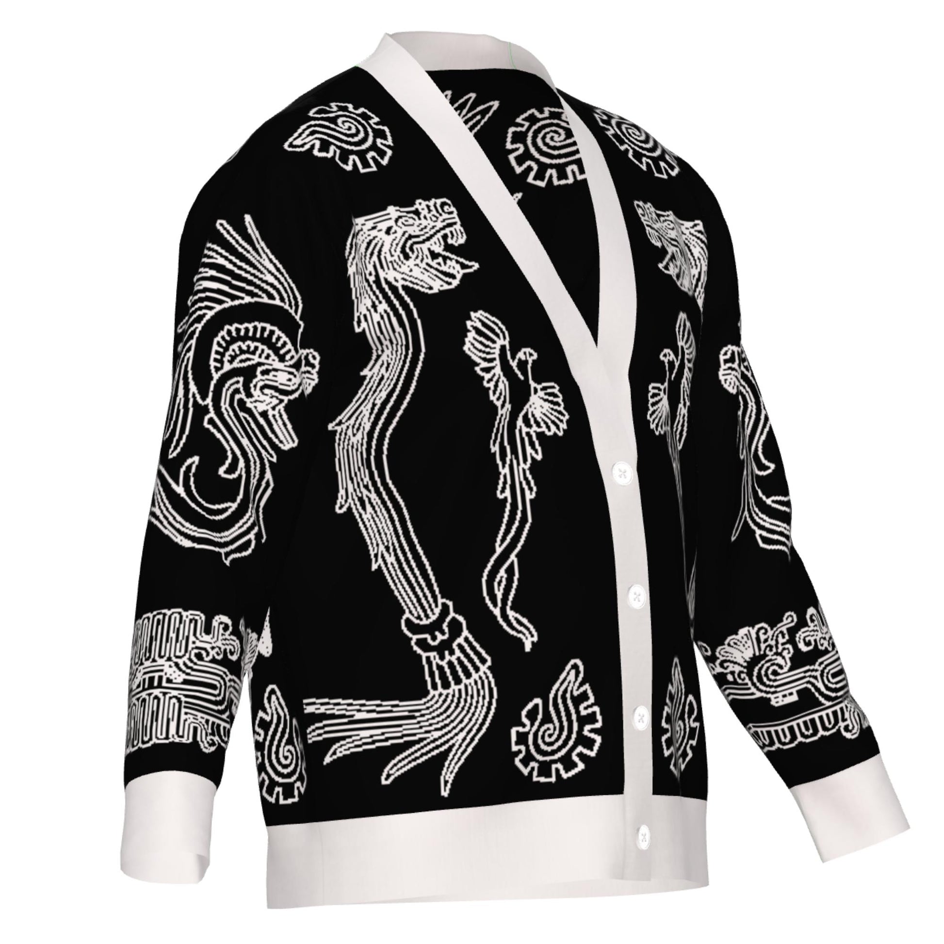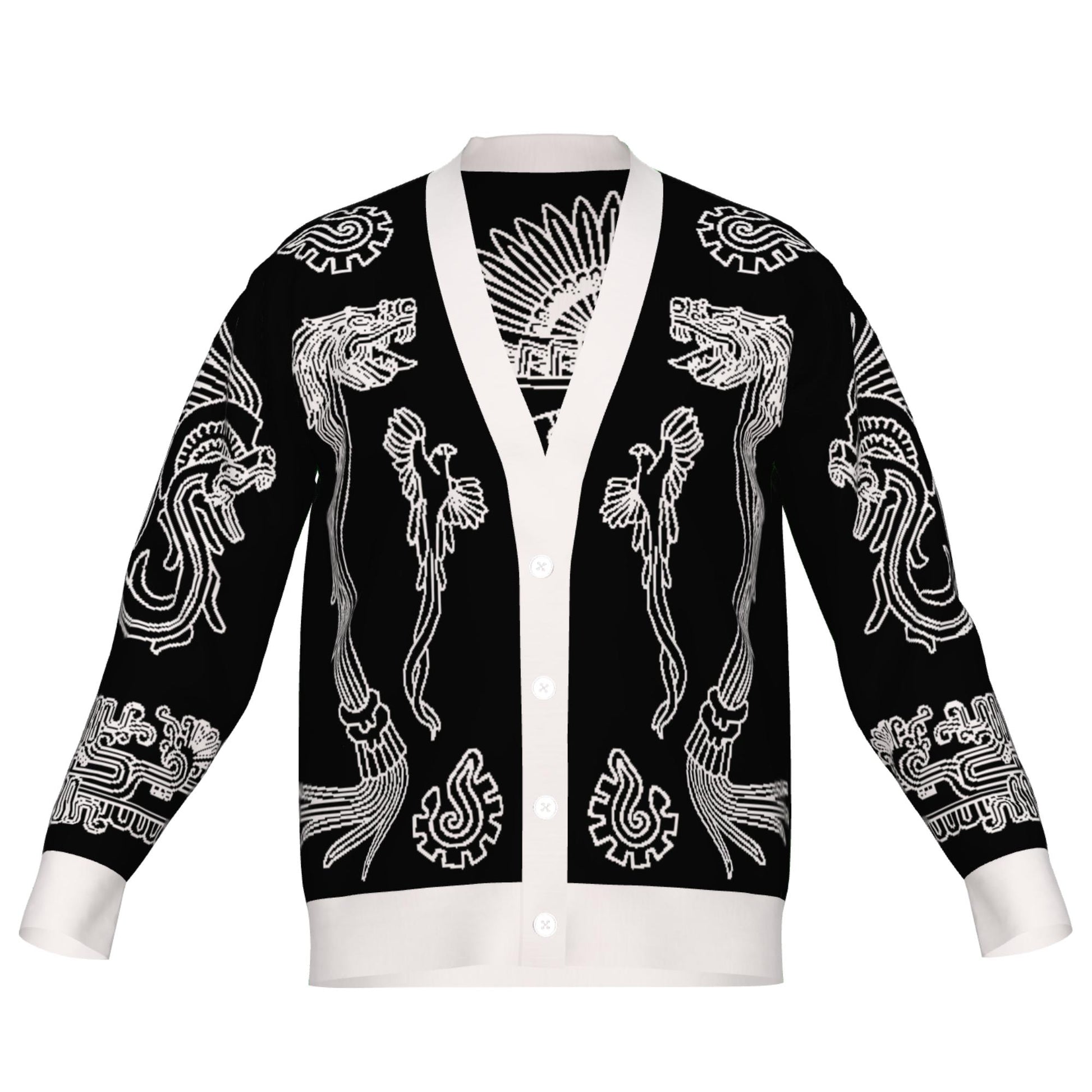 The front of the cardigan features flowing Quetzalcoatl's, accompanying Quetzal birds and shells above and below. The sleeves carry a flowing, S-shaped Quetzalcoatl from the Telleriano Codex.