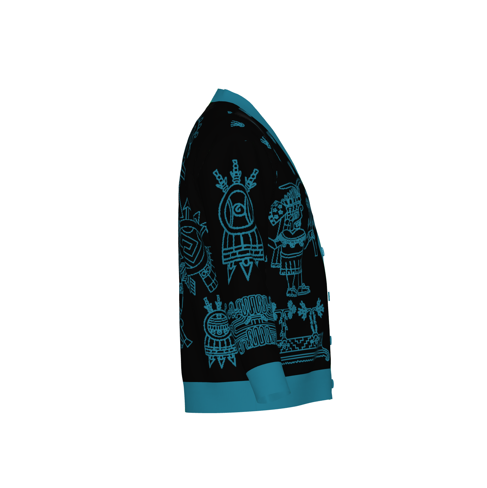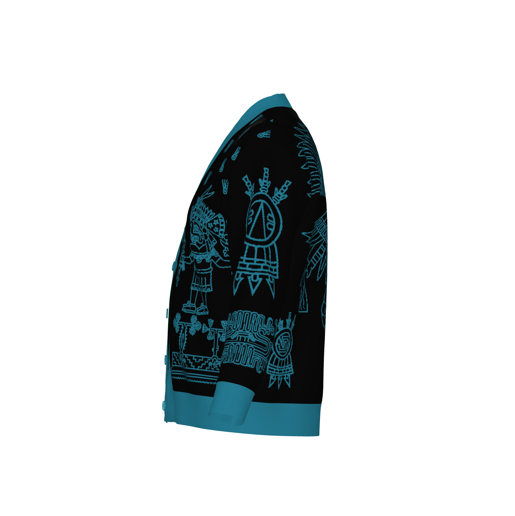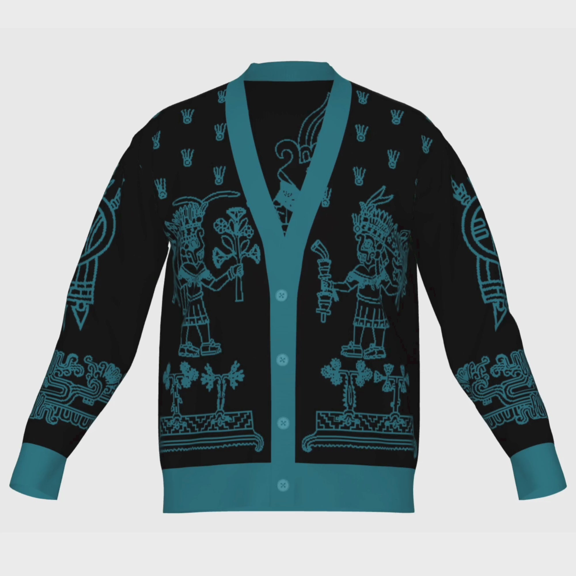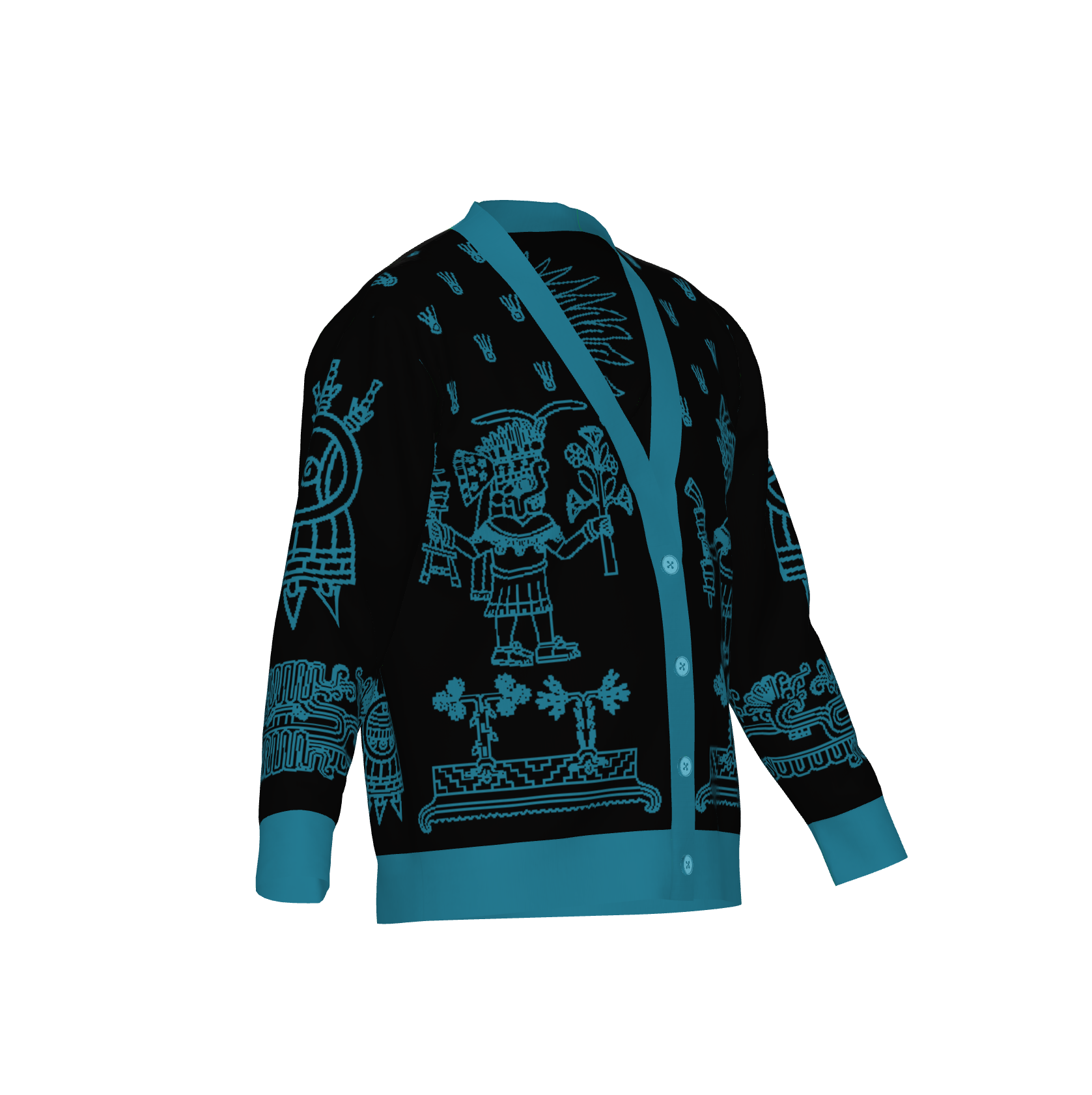 The front of the cardigan features two different depictions of Tlaloc, bringing rain that cultivates the growth of plants and flowers below. The sleeves display two war shields, paired with ornate decorative forearm designs.