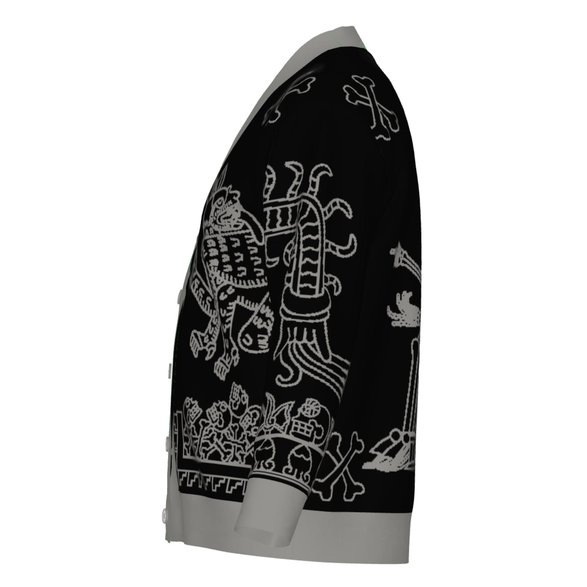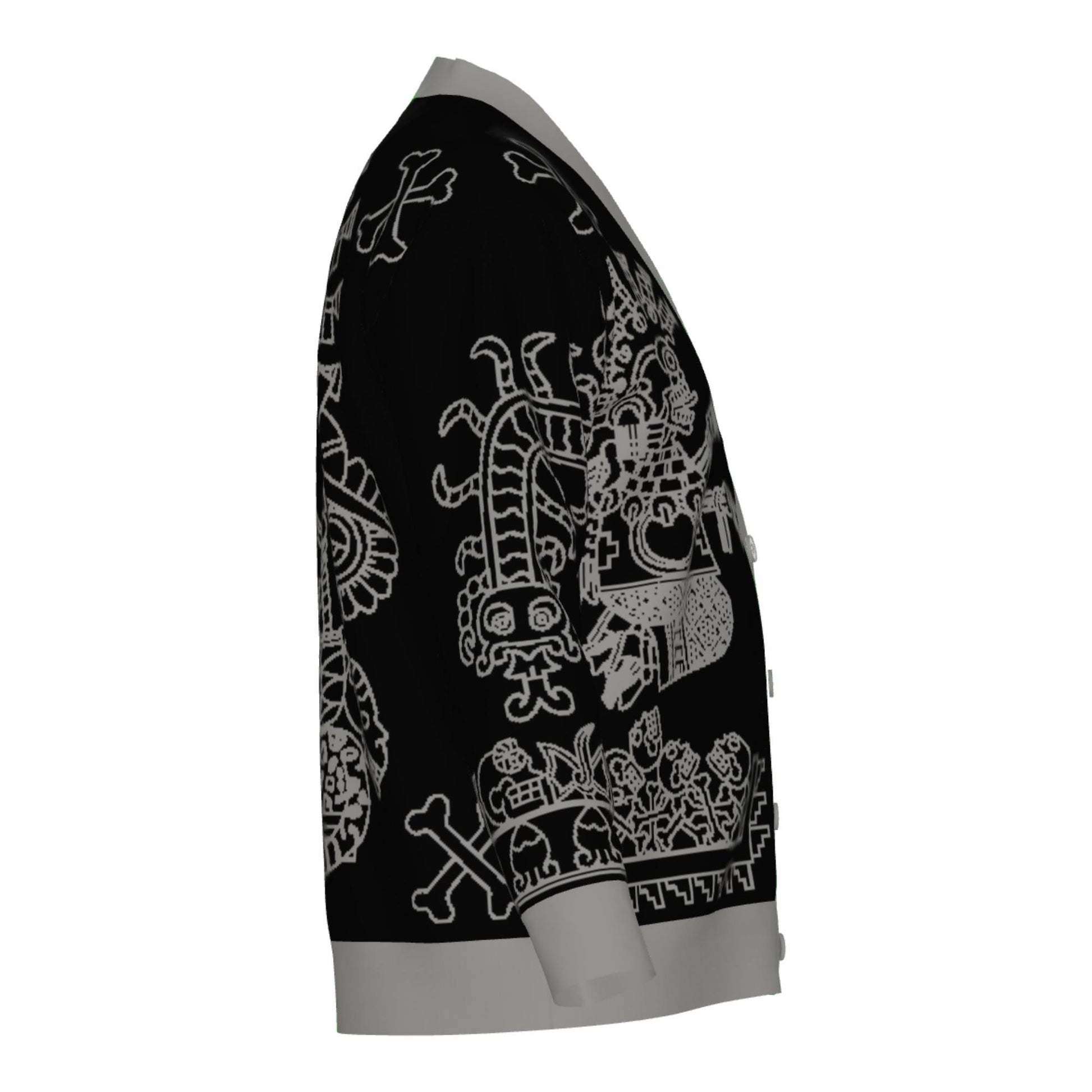 The front of the cardigan features Mictlancihuatl, wife of Mictlantecuhtli, accompanied by a Xolotl, who guides souls to and through their journey of the underworld. The lower hem features containers of skulls and bones. The sleeves carry a large centipede traveling across both arms, framed by skull-and-heart border details.