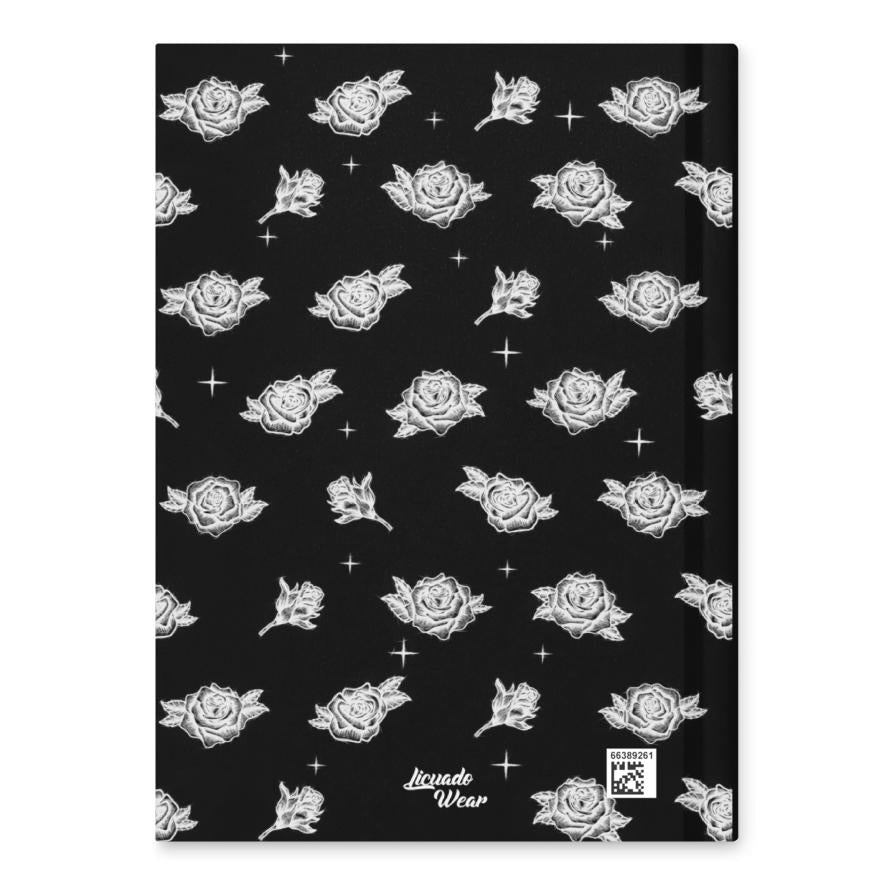 This striking black-and-white hardcover journal features the word “Palabra” in bold Old English lettering, repeated down the cover and gradually fading—like an echo from the past into the present. In the corner, three blooming roses frame the word, symbolizing beauty, loyalty, and resilience. The back is adorned with a subtle rose pattern that completes the design with quiet strength.