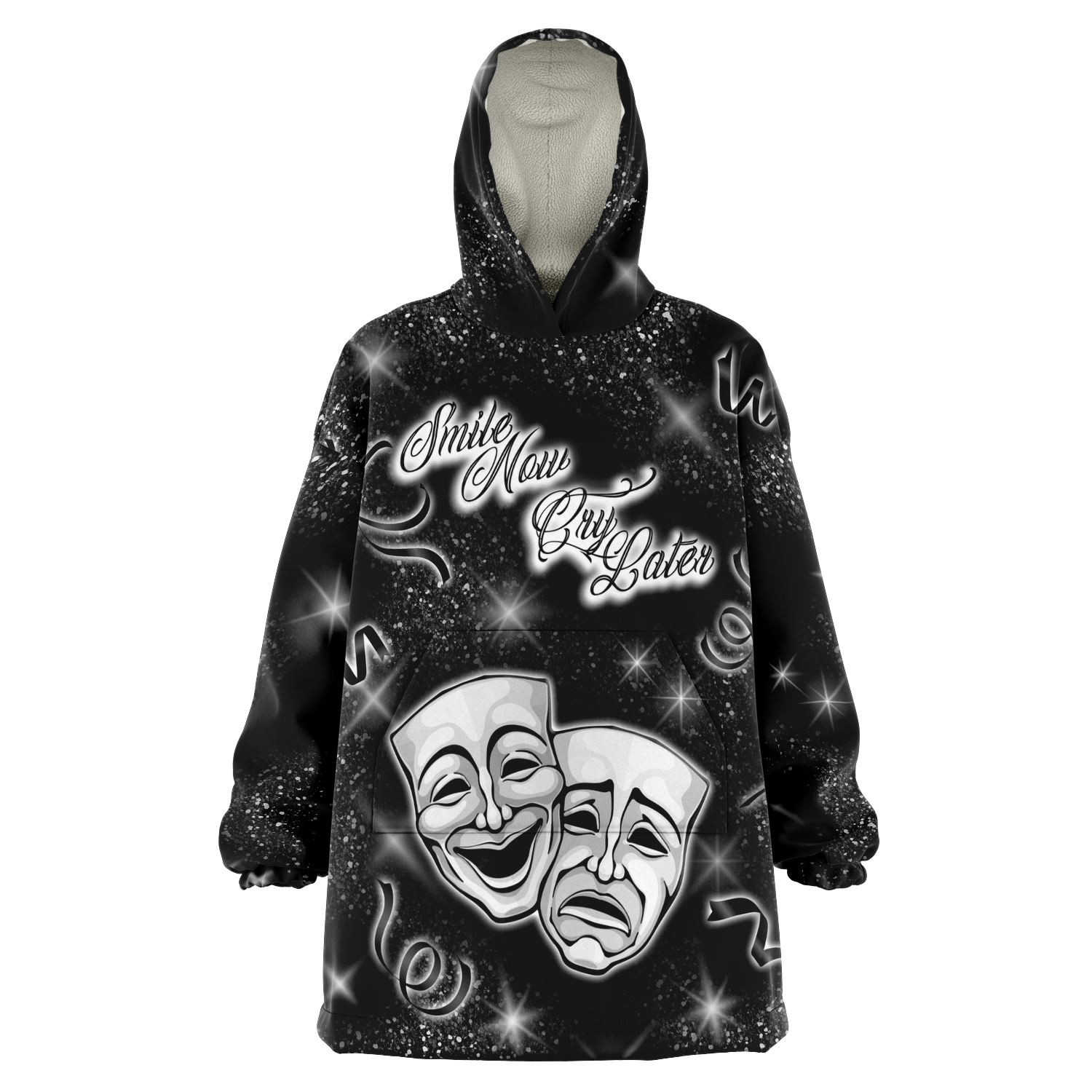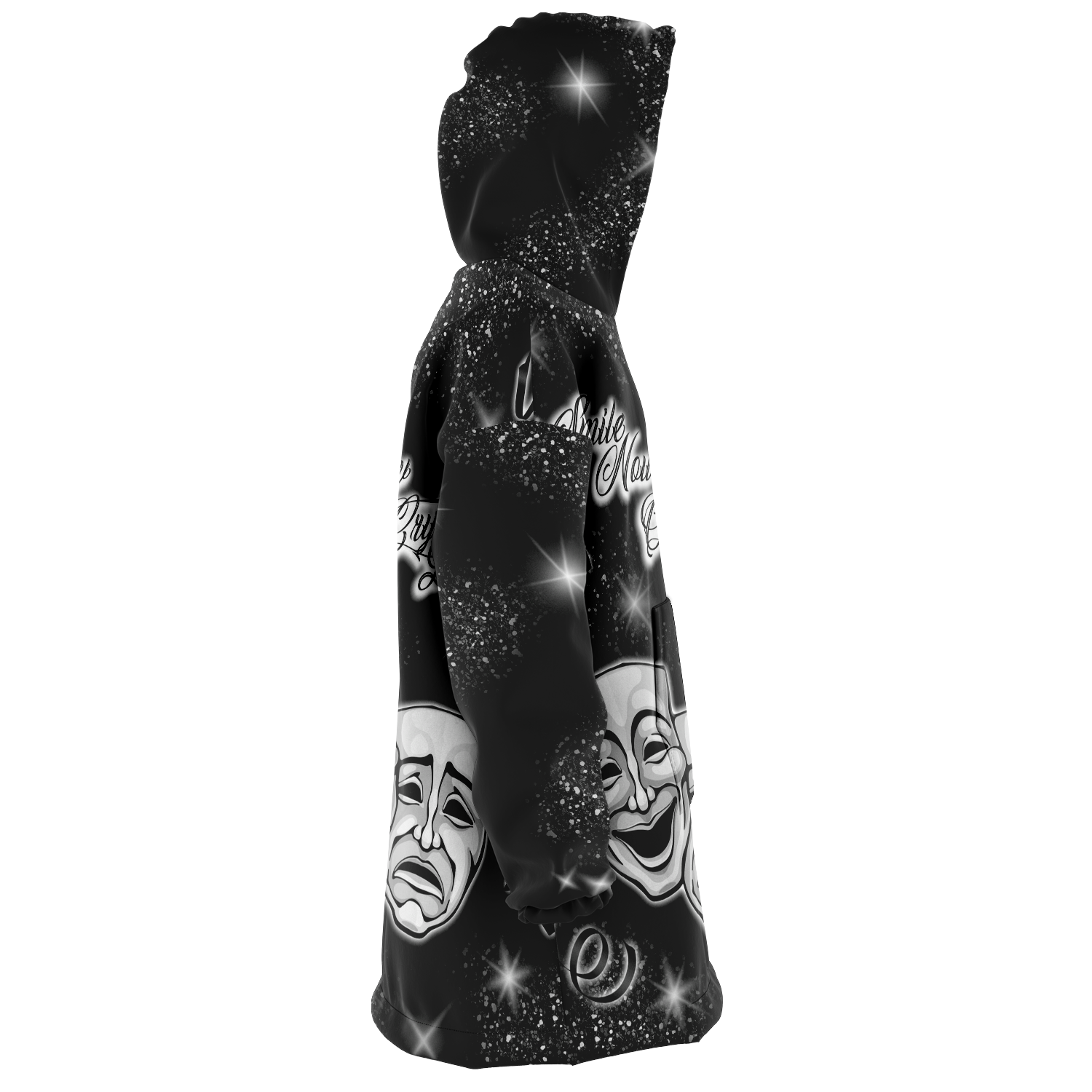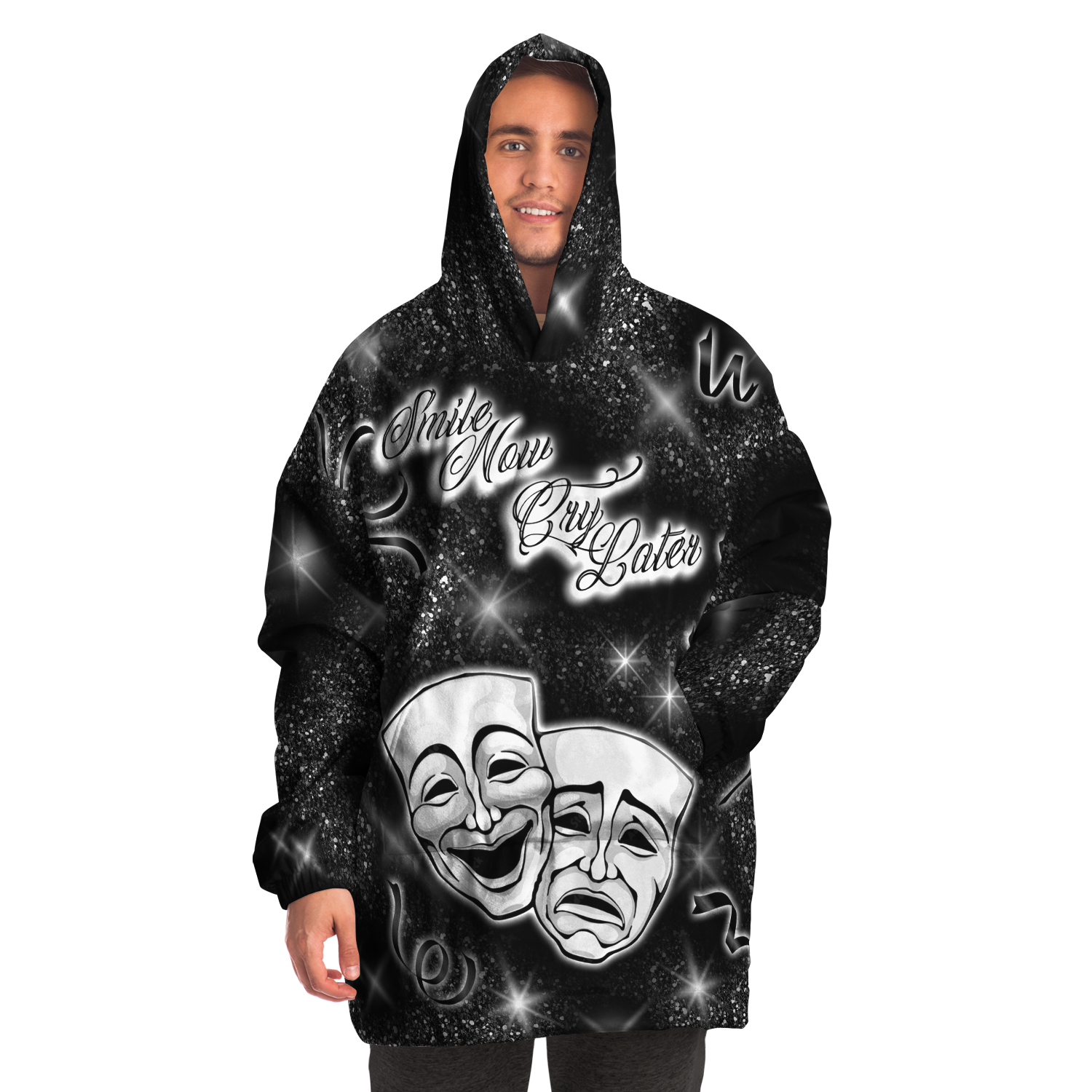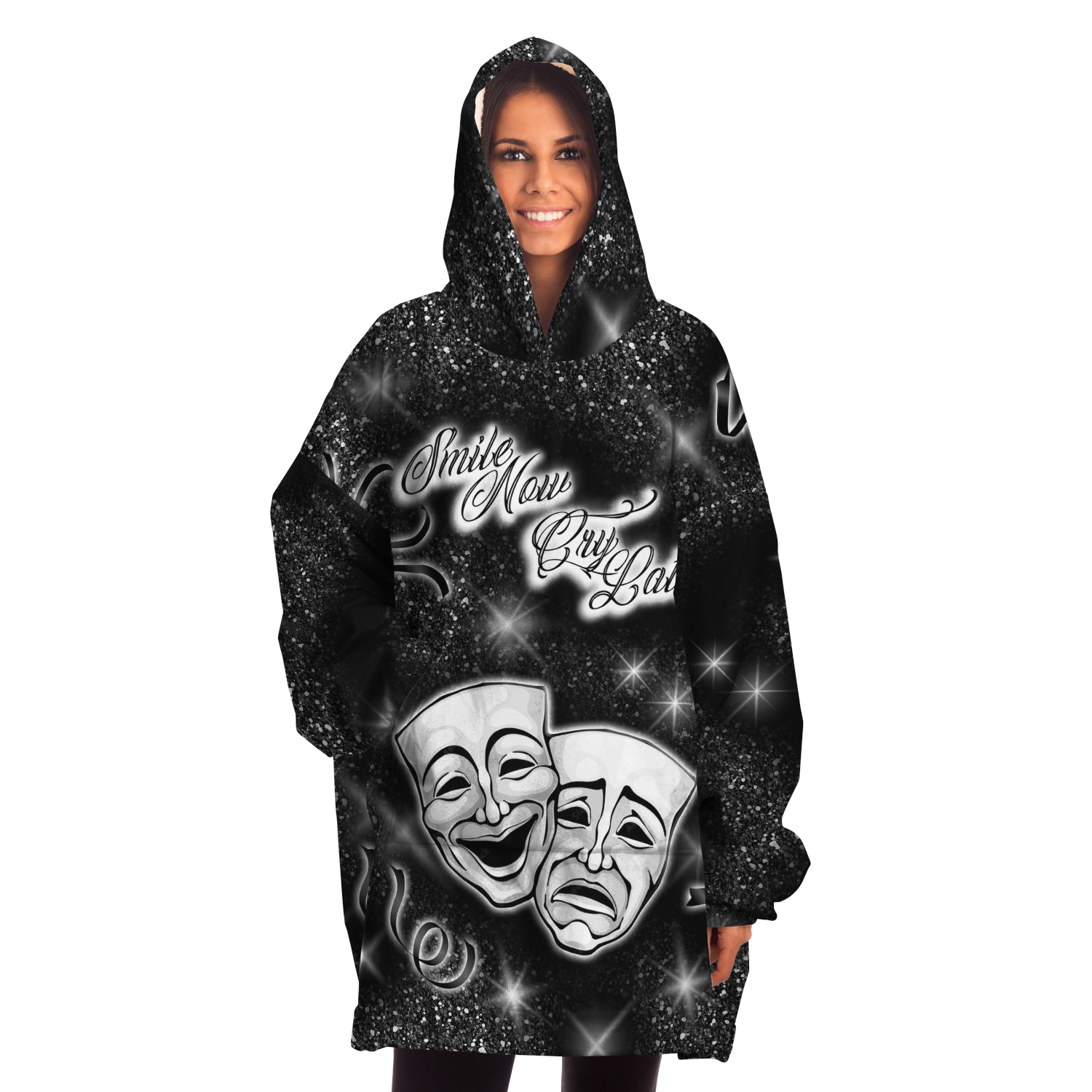 This is a one-size-fits-all wearable blanket hoodie. Crafted from an outer silky smooth micro-mink polyester face. Inside lining is an ultra-soft faux sherpa lining. Each panel is individually printed, cut, and sewn.