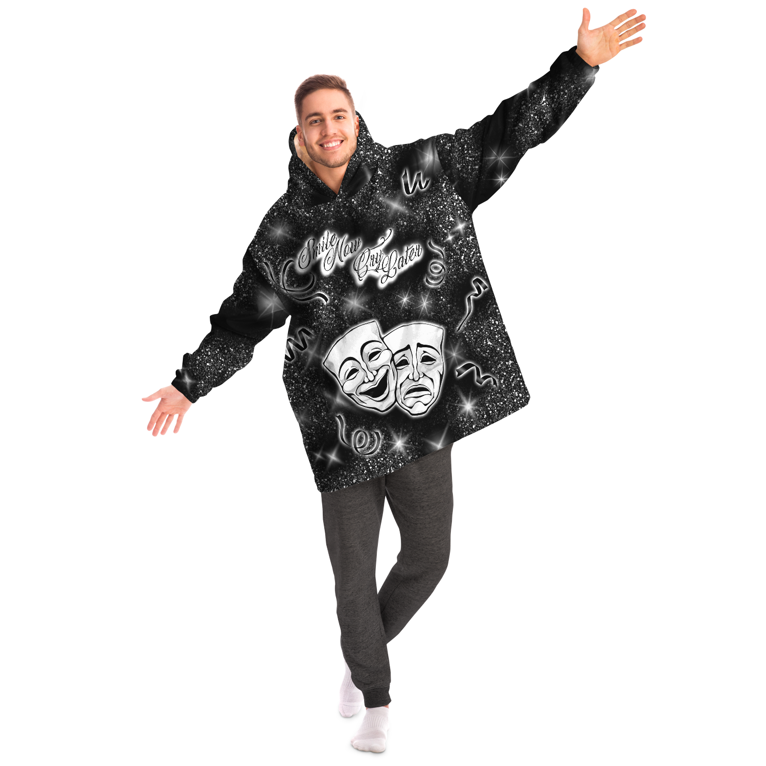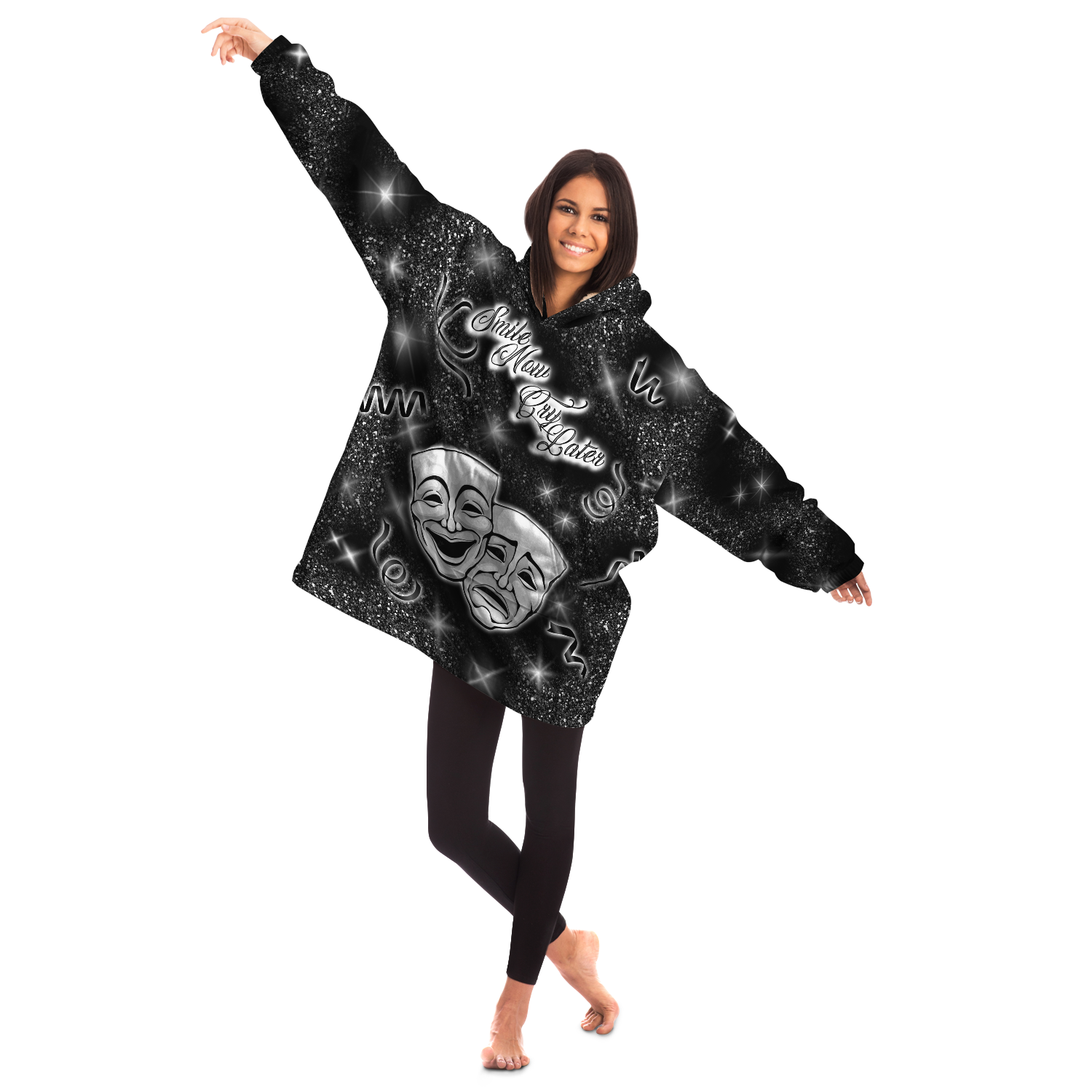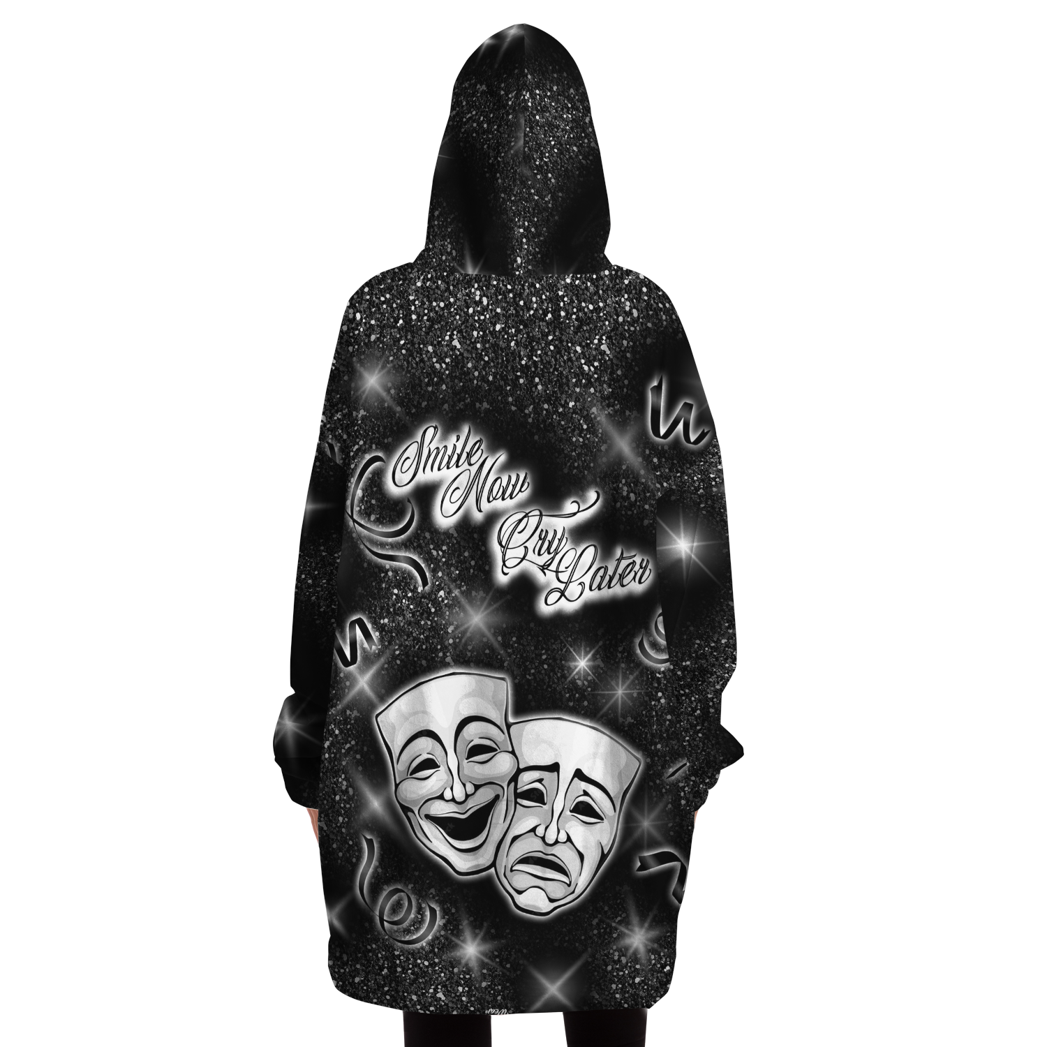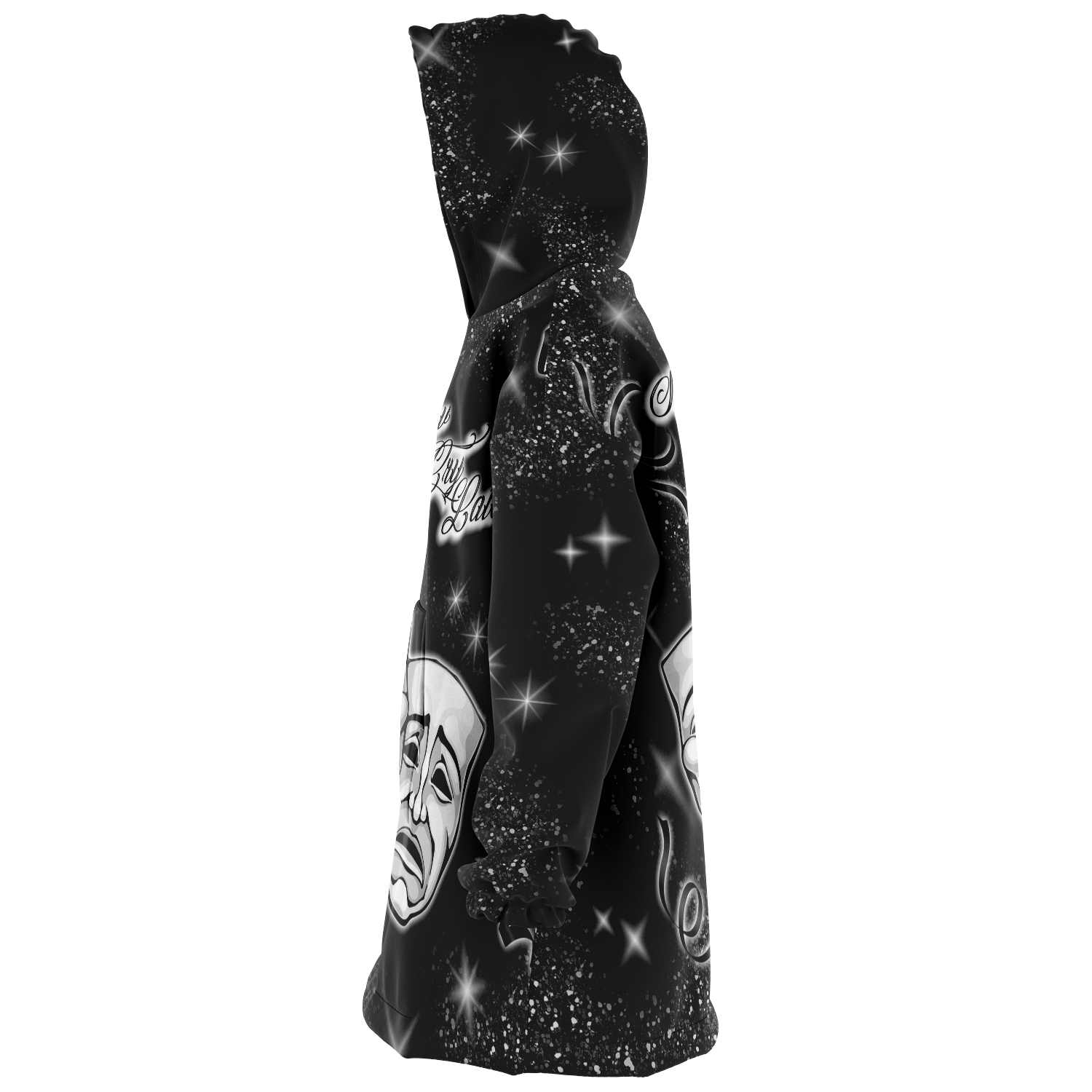 This is a one-size-fits-all wearable blanket hoodie. Crafted from an outer silky smooth micro-mink polyester face. Inside lining is an ultra-soft faux sherpa lining. Each panel is individually printed, cut, and sewn.